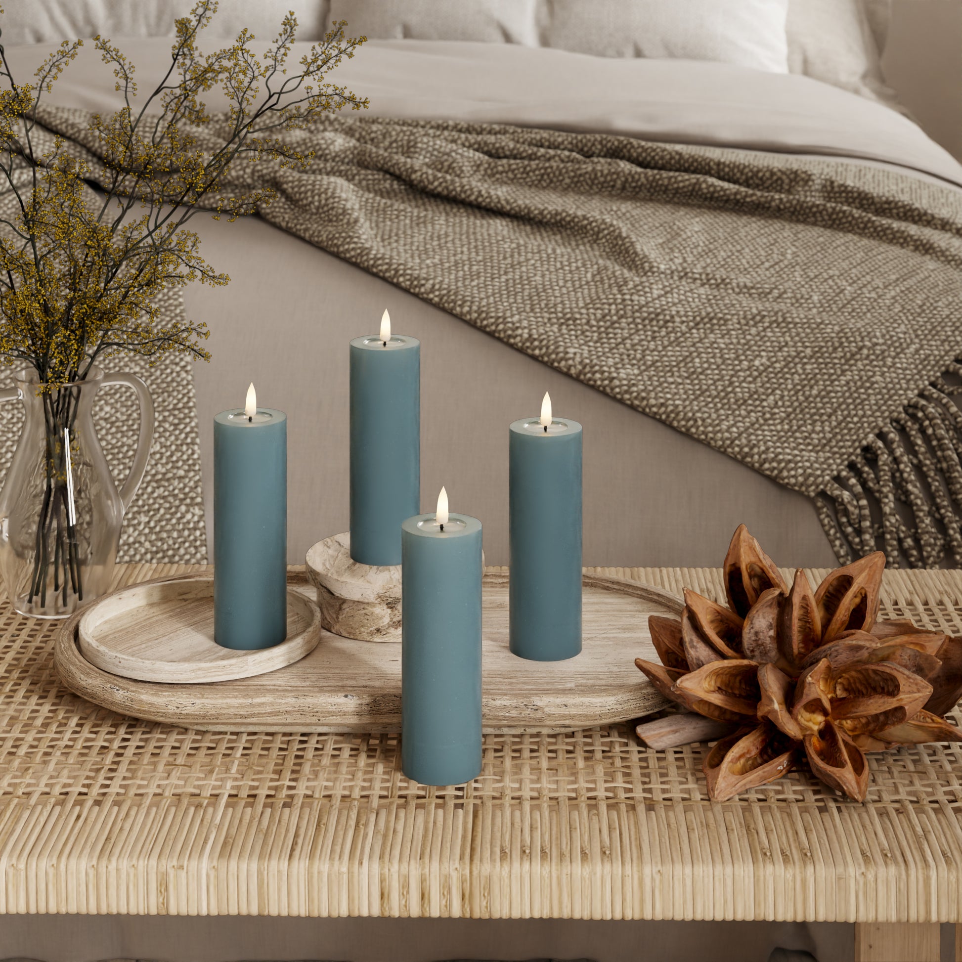 Brug bloklys i små grupper med forskellige højder. Det giver dybde og et gennemført udtryk i indretningen.